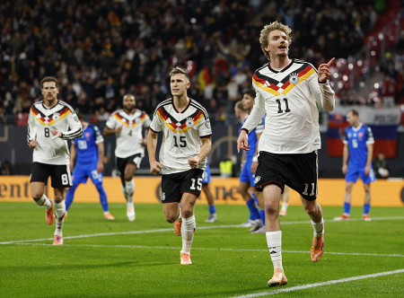 サッカーの2026年W杯欧州予選。ドイツはA組最終節で、勝ち点で並んでいた2位スロバキアに6―0と圧勝。西ドイツ時代を含めて19大会連続21度目の切符をつかんだ=17日、ドイツ・ライプチヒ 【AFP時事】