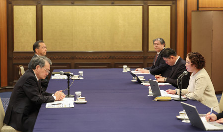日本商工会議所の小林健会頭(左端)と連合の芳野友子会長(右端)は3日、東京都内で会談し、2026年春闘で中小企業の大幅賃上げを実現するため、価格転嫁が進展するよう協力することを確認した。 【時事通信社】