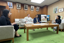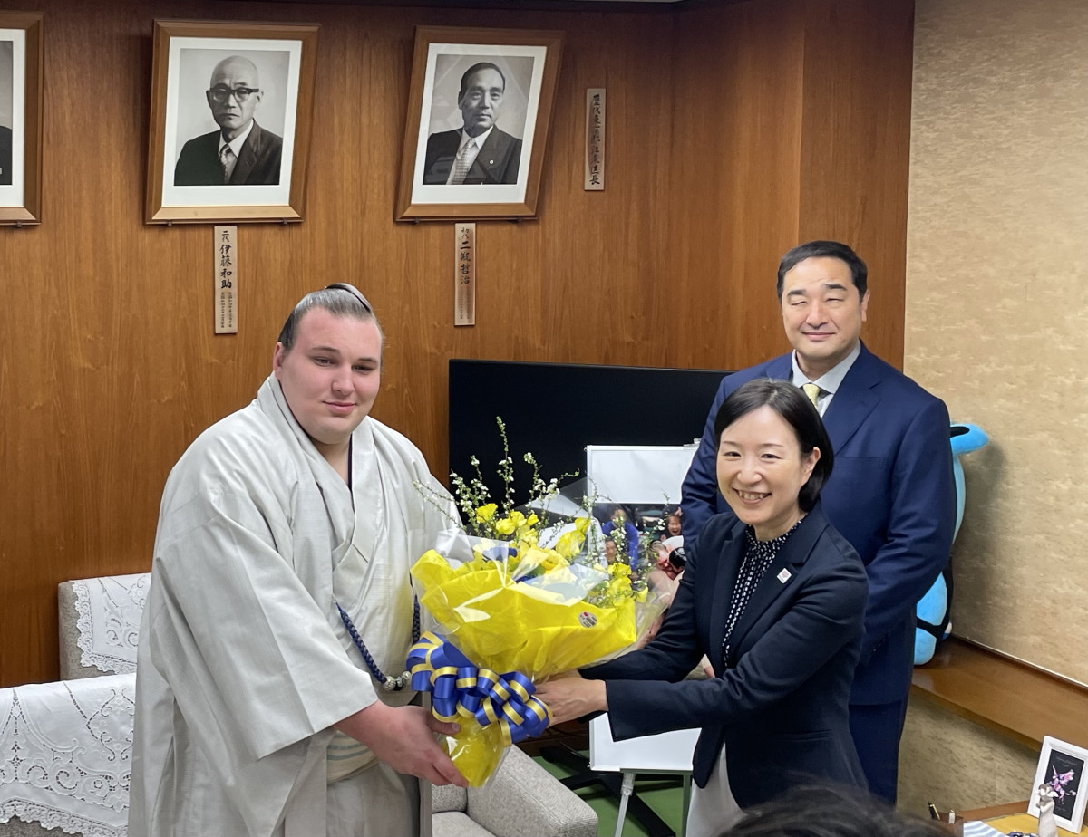 江東区内に部屋を構える安治川部屋(江東区石島4)の大関・安青錦(あおにしき)関が2月5日、1月場所の優勝を報告するため大久保朋果江東区長を表敬訪問した。
