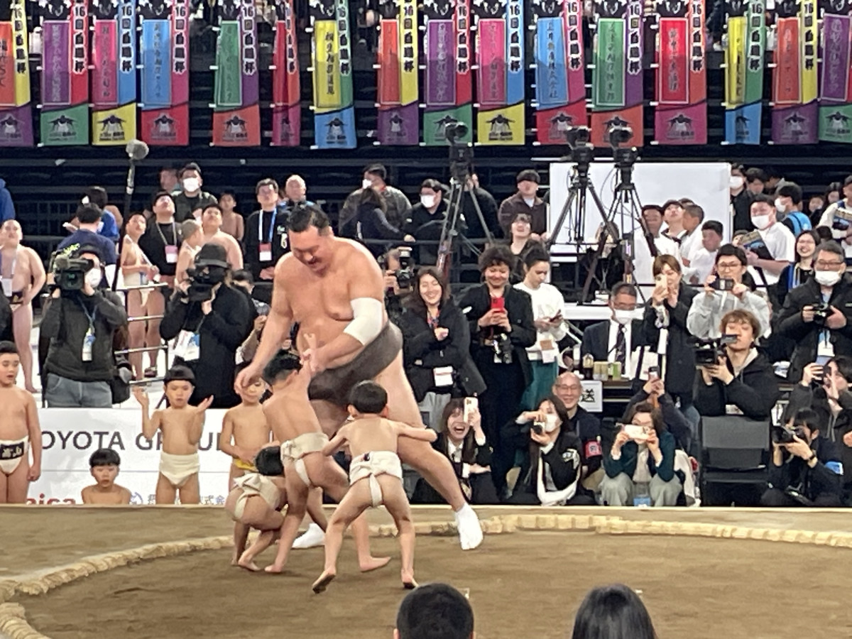 幼児相撲教室でたくさんの幼児と対戦した白鵬さん