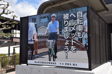 岡山県は、自転車乗車時のヘルメット着用率の向上に向けて伊原木隆太知事の写真入り啓発看板を設置した。設置場所は県庁近くの交番で、縦142.5センチ、横180センチ=13日、岡山市北区 【時事通信社】