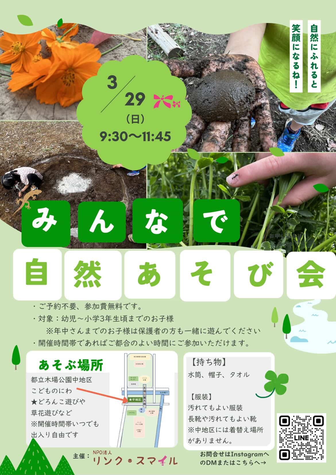 身近な自然に触れ、泥んこになって遊ぶイベント「みんなで自然あそび会」が3月29日、木場公園(江東区木場4)中地区の「こどものにわ」で開催される。