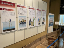 深川めしを構成する「貝」「ねぎ」「しょうゆ」「米」を資料や当時使われていた道具、出土した現物の展示を通じて紹介する。
