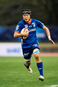 後半は開始直後の2分に敵陣22メートル付近のターンオーバーでボールを奪ってからウイングで出場の尾崎達洋(たつひろ)選手がトライ。バーンズ選手のコンバージョンゴールも成功し、14-3と点差を広げる。