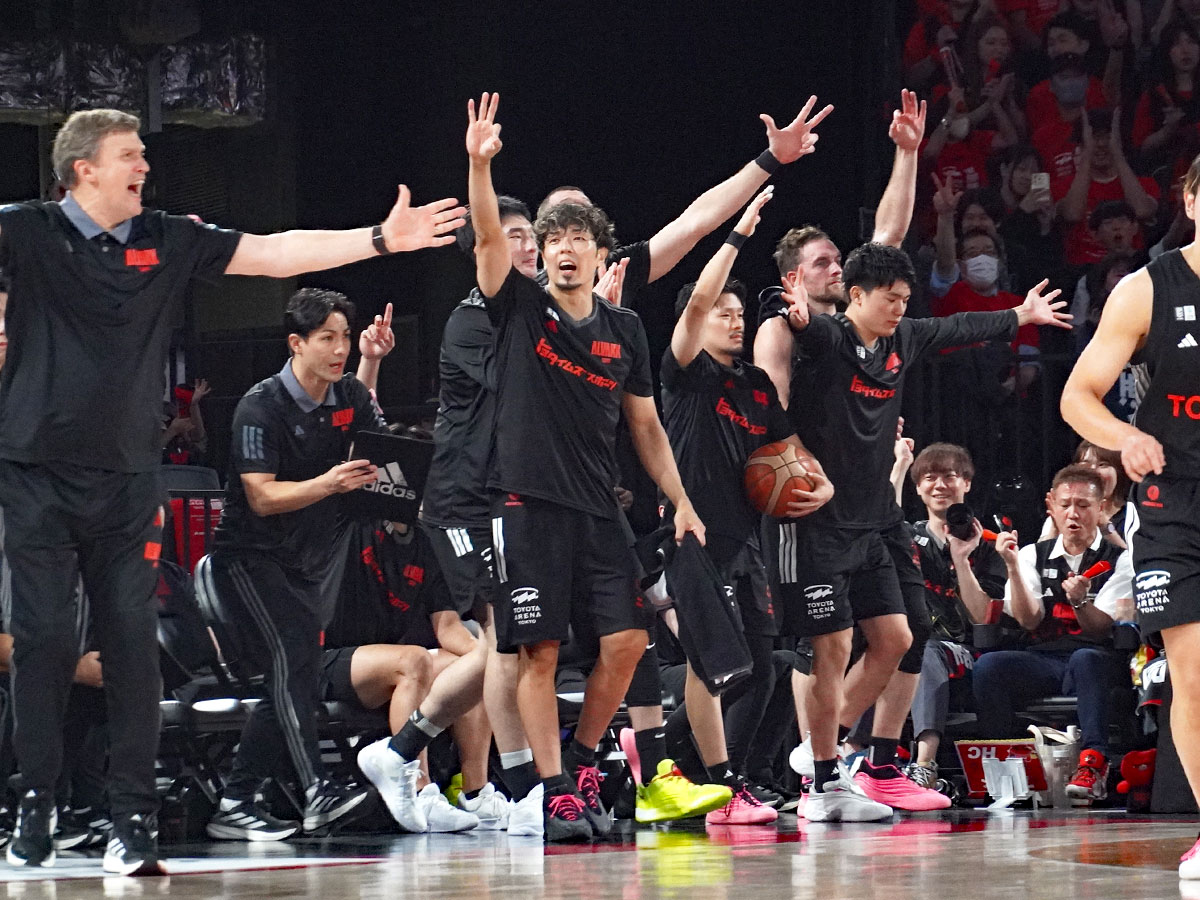 3ポイントが決まり、盛り上がるアルバルク東京ベンチ