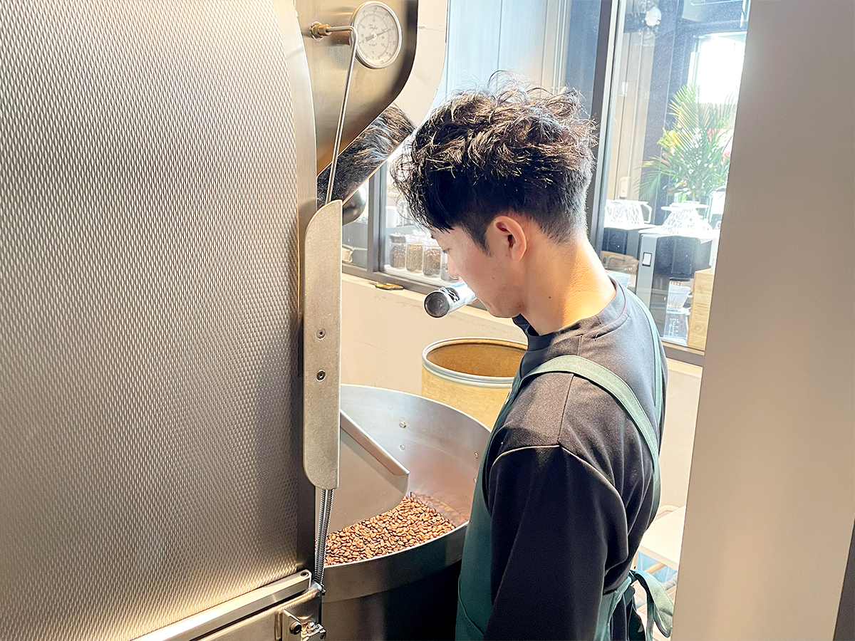店舗の奥にある焙煎機で焙煎をする千田さん