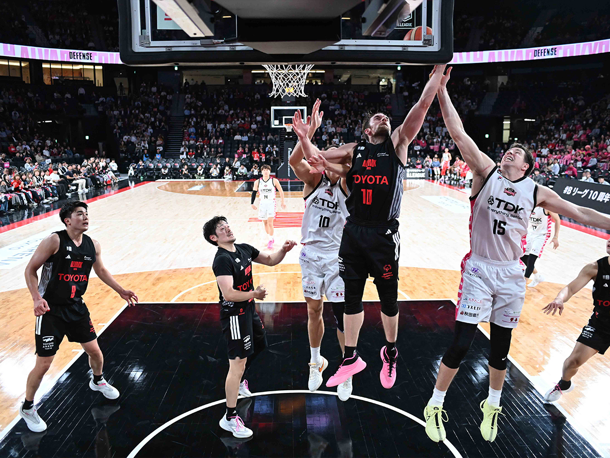 ピンクバッシュを履くザック・バランスキー選手はリバウンドやアシストで奮闘(画像提供=アルバルク東京)