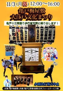 亀戸駅から徒歩すぐの場所にある亀戸梅屋敷(江東区亀戸4)が「文化の日」の11月3日、みこしの巡行と江戸の文化と芸能を披露する祭り「大江戸文化まつり」を開催する。
