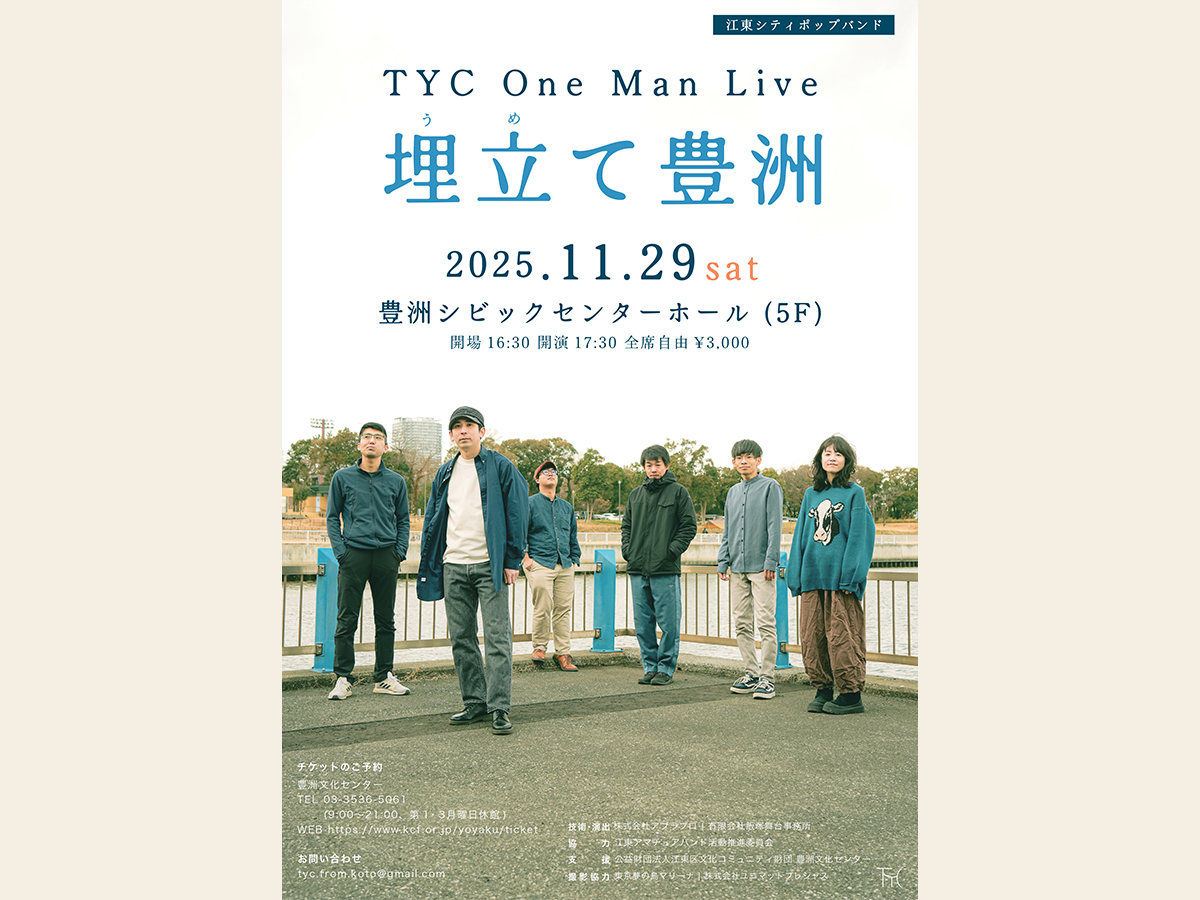 江東区のことだけを歌うシティーポップバンド「TYC」が11月29日、豊洲シビックセンター(江東区豊洲2)で、バンドとしてホールでの初のワンマンライブを開催する。