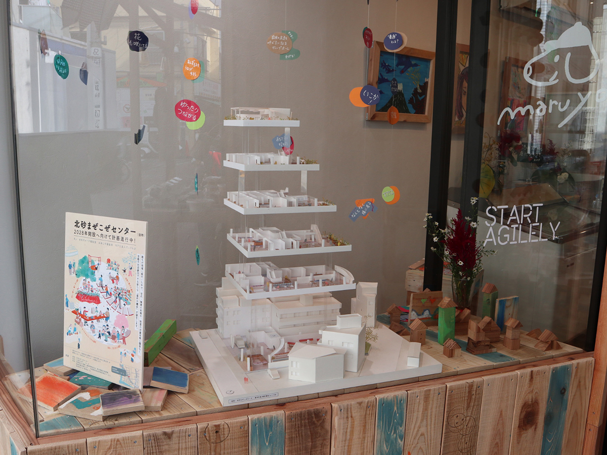 2028年江東区北砂に建設予定の複合福祉センター「北砂まぜこぜセンター(仮称)」の模型が入口で出迎える