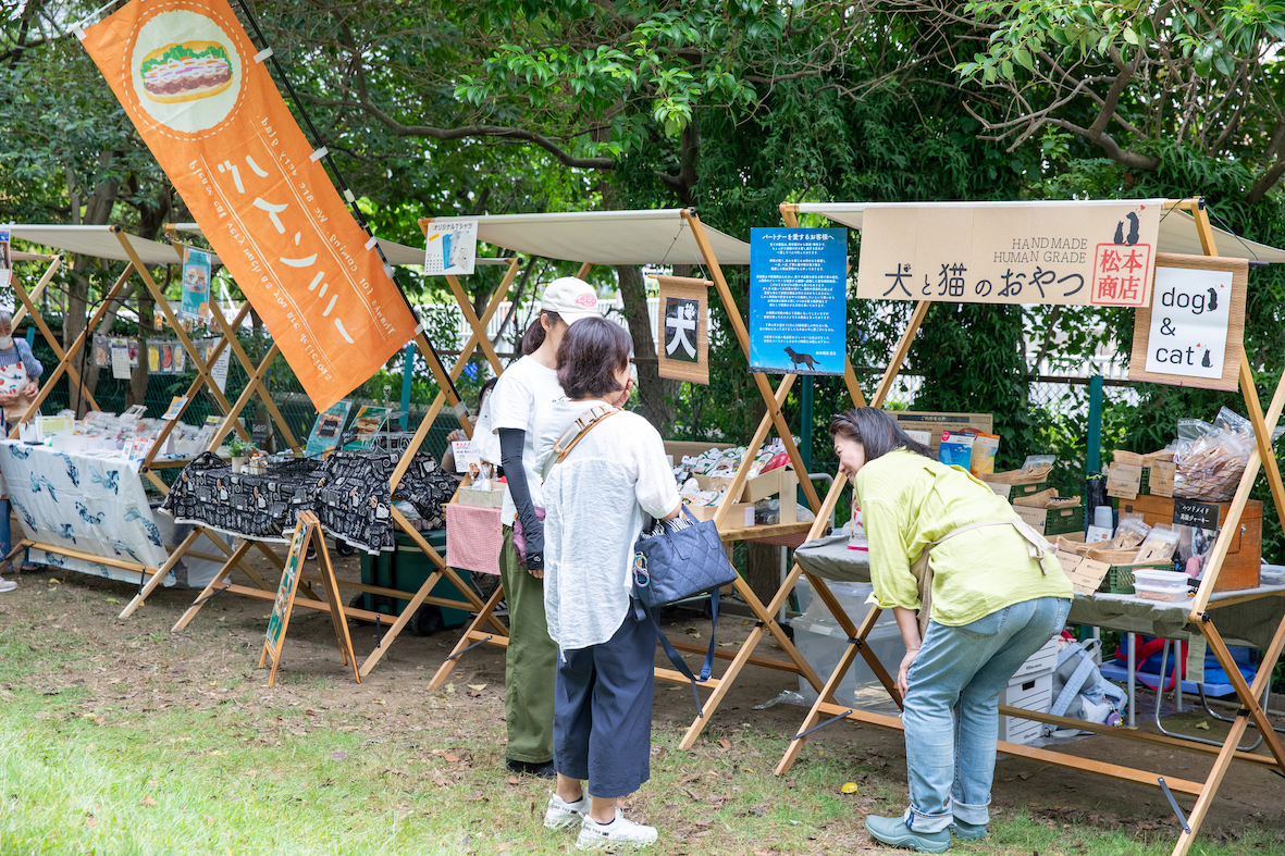 野菜、酒、花、古着などの地域店舗が並ぶ