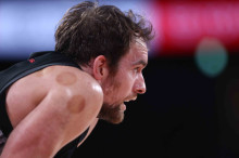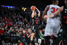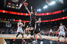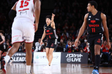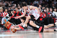 ドルフィンズの齋藤拓実選手とルーズボールを争う中村浩陸選手
