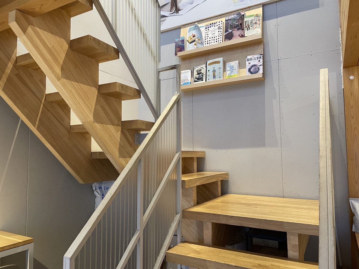 階段途中にあるコーヒー関連の書籍は店内で閲覧可能