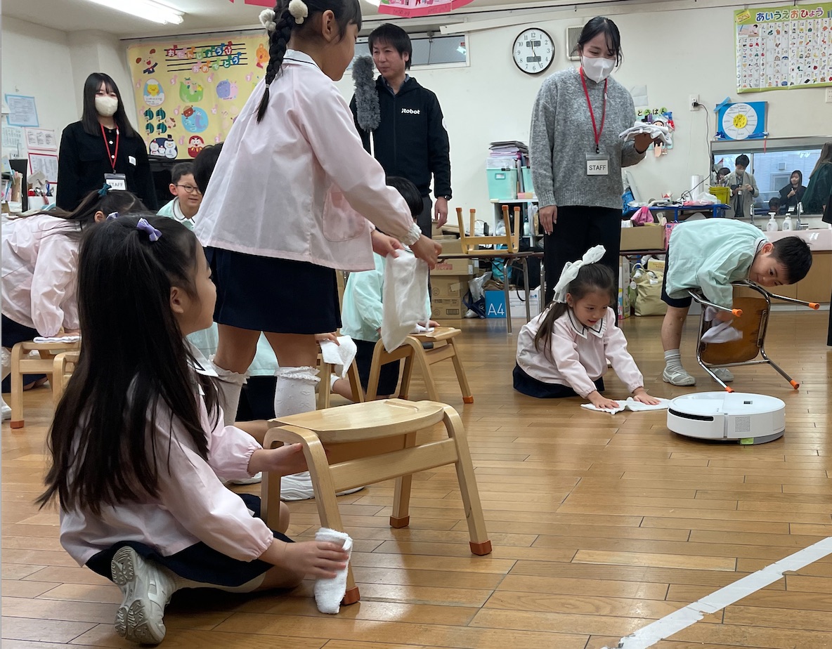 ルンバと一緒に大掃除する園児たち