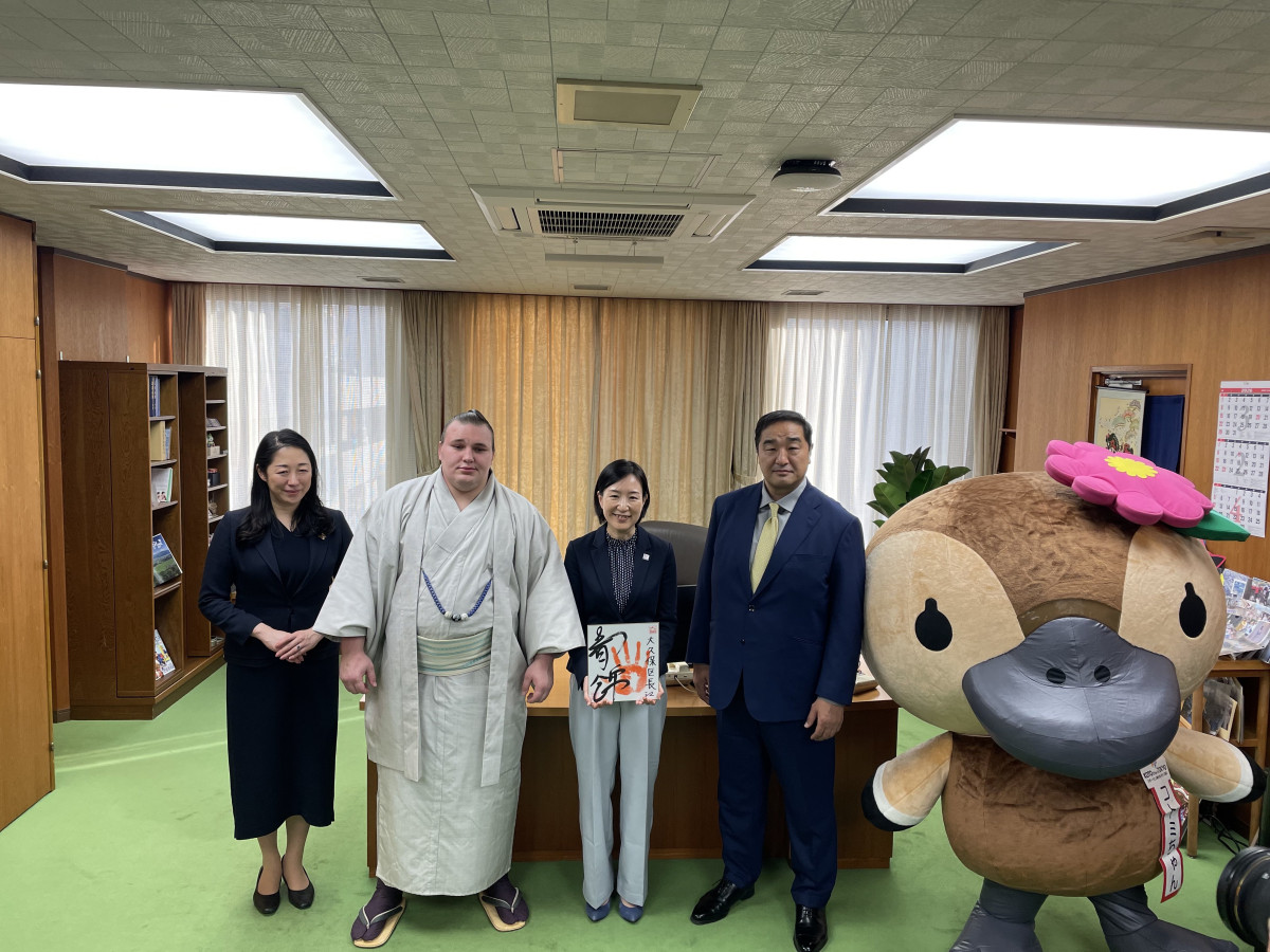 江東区内に部屋を構える安治川部屋(江東区石島4)の大関・安青錦(あおにしき)関が2月5日、1月場所の優勝を報告するため大久保朋果江東区長を表敬訪問した。