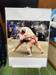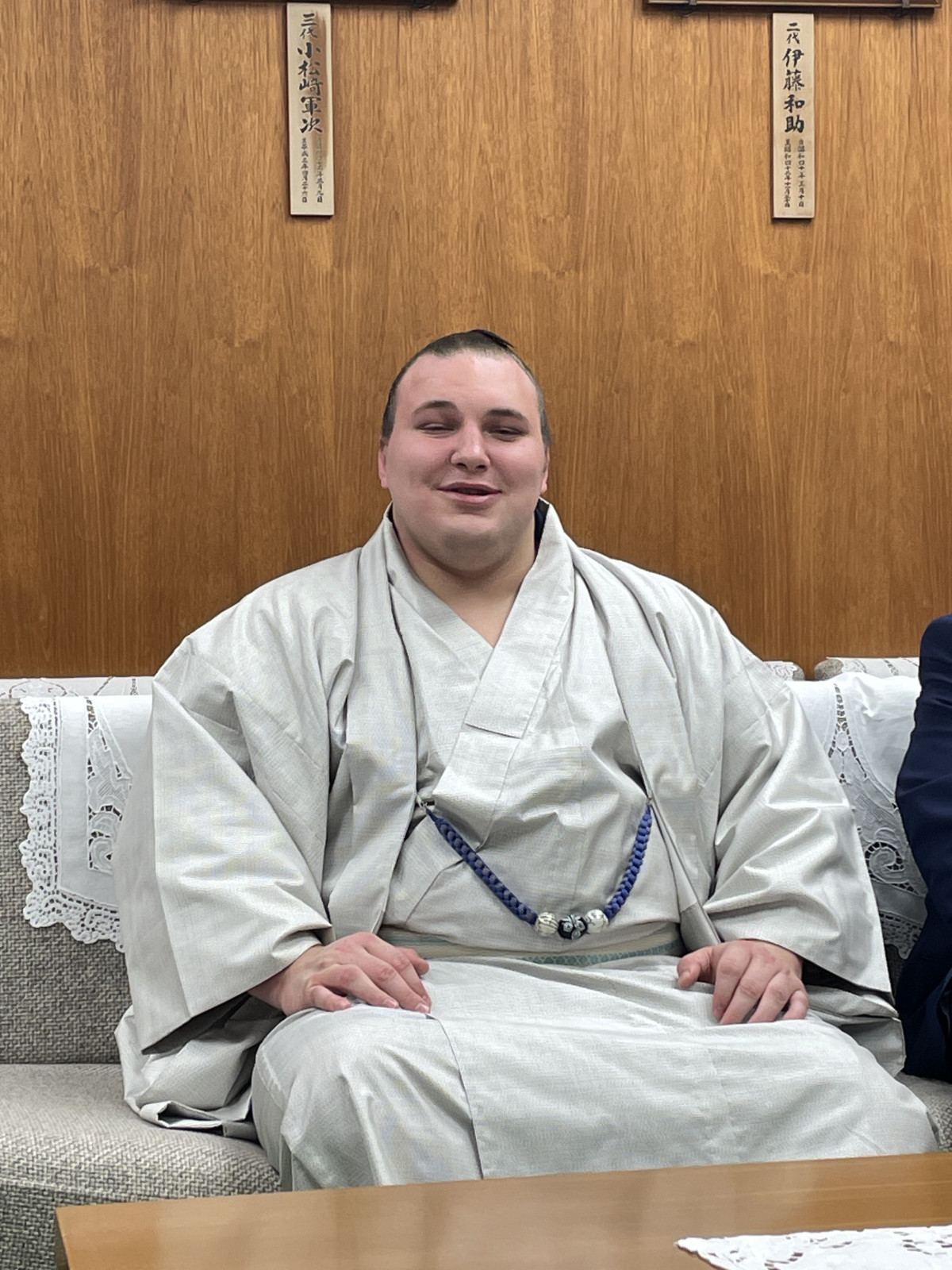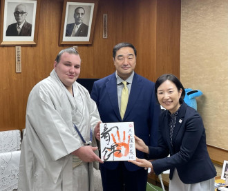 江東区内に部屋を構える安治川部屋(江東区石島4)の大関・安青錦(あおにしき)関が2月5日、1月場所の優勝を報告するため大久保朋果江東区長を表敬訪問した。