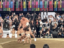 幼児相撲教室でたくさんの幼児と対戦した白鵬さん