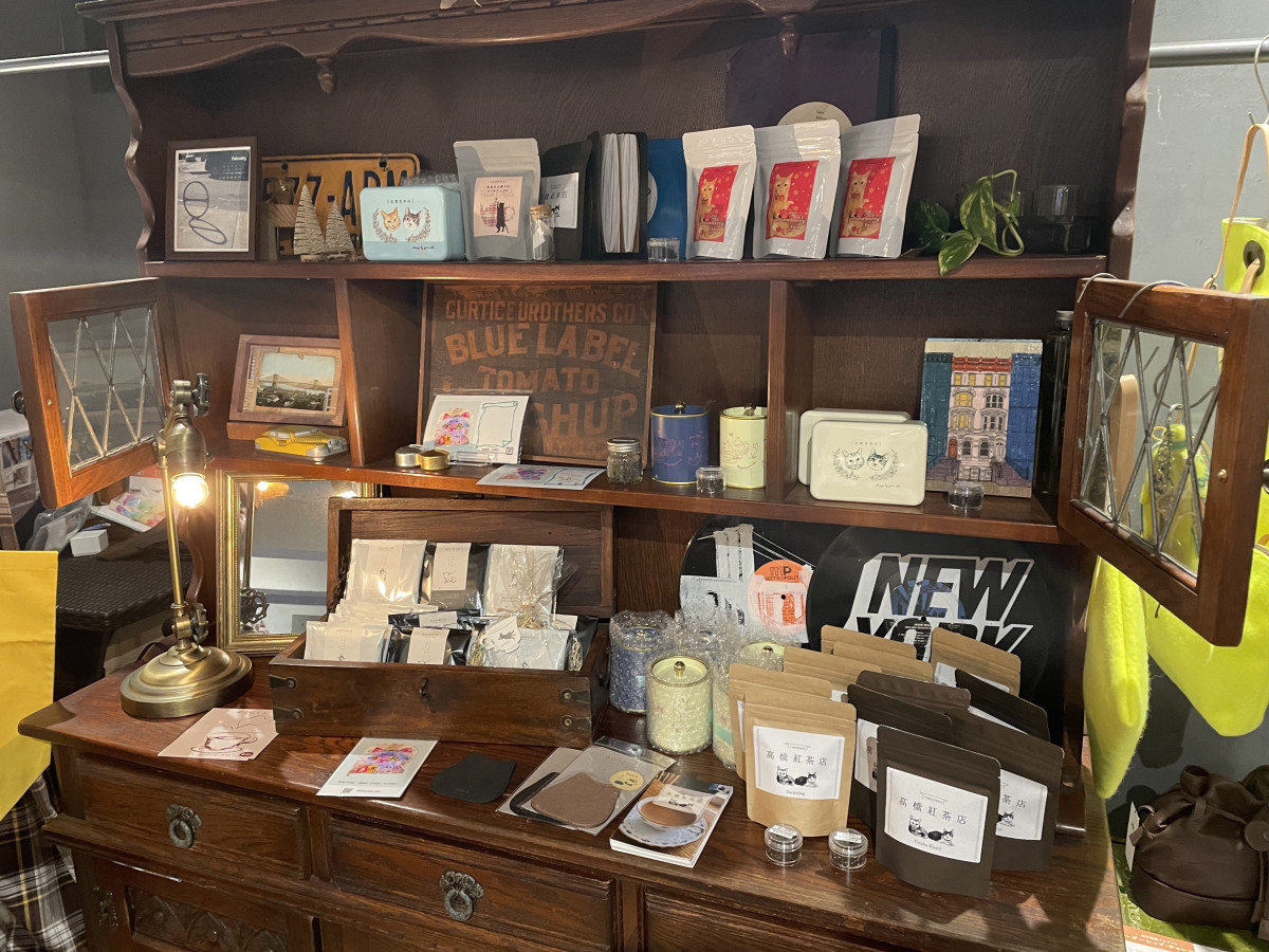 「喫茶こくん」とコラボしたコーヒーのドリップバッグと「高橋紅茶店」の紅茶のコーナー