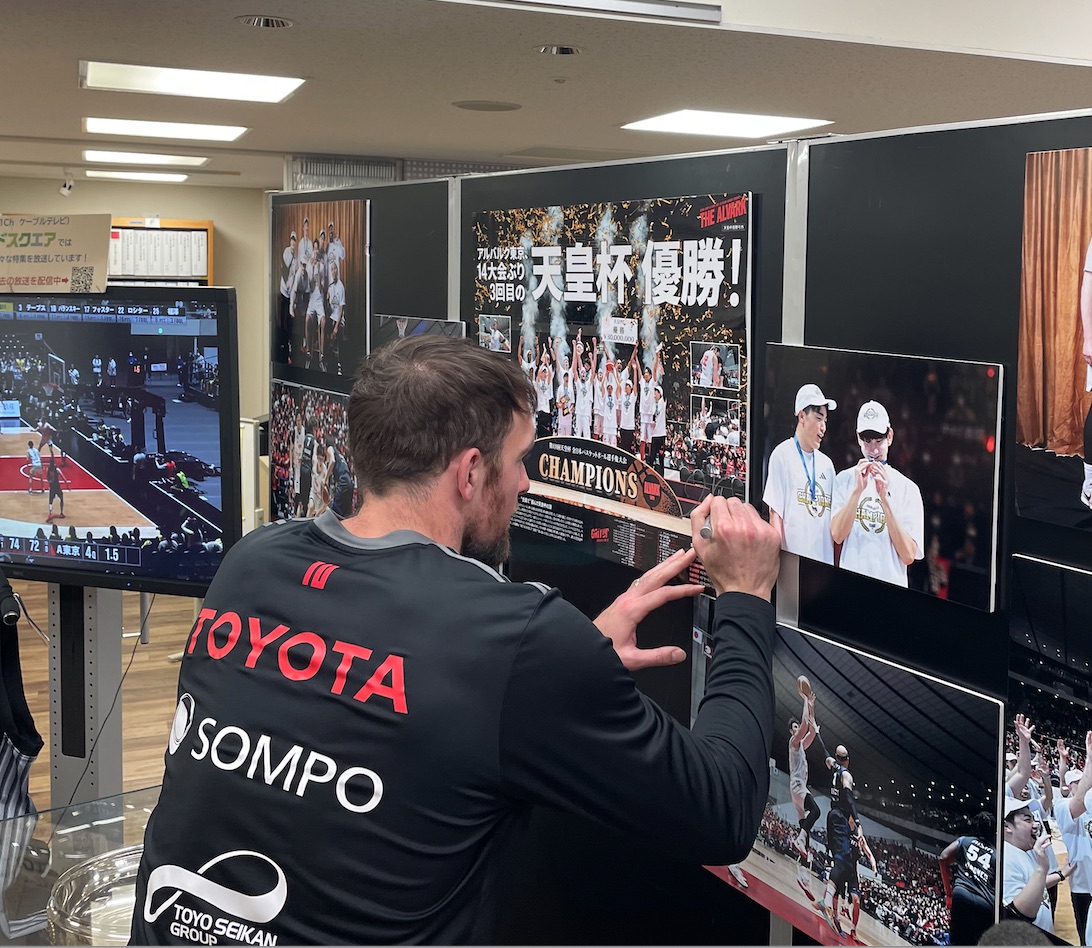 アルバルク東京の天皇杯優勝展示パネルにサインをするバランスキー選手
