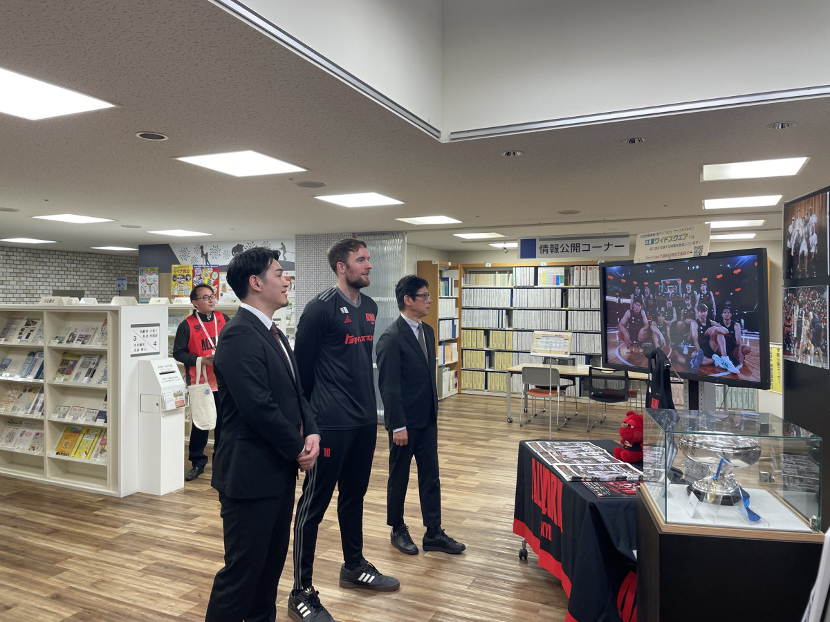 江東区役所2階の展示スペースを訪れたアルバルク東京の3人
