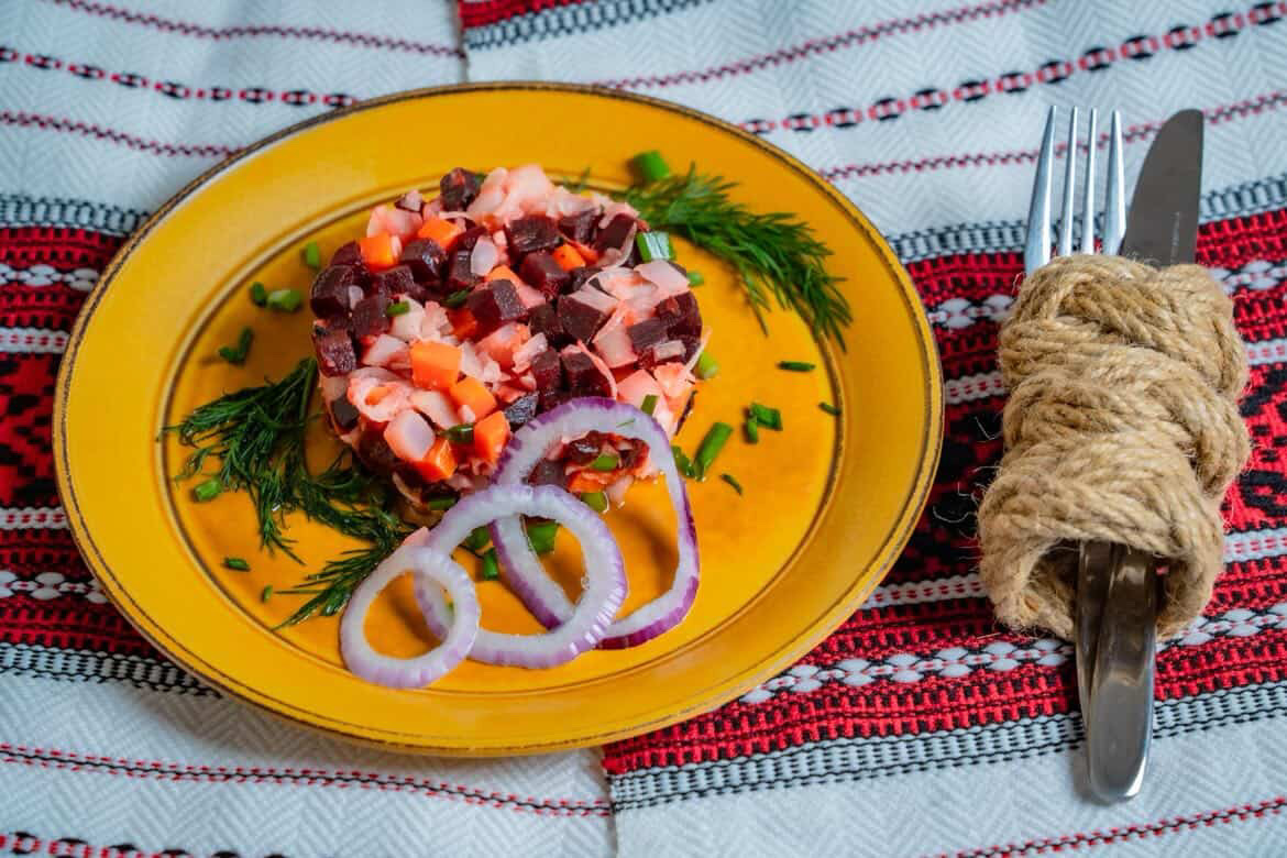 ダイス状にした茹でたビーツ、ジャガイモ、ニンジン、タマネギ、ピクルスを和えたサラダ